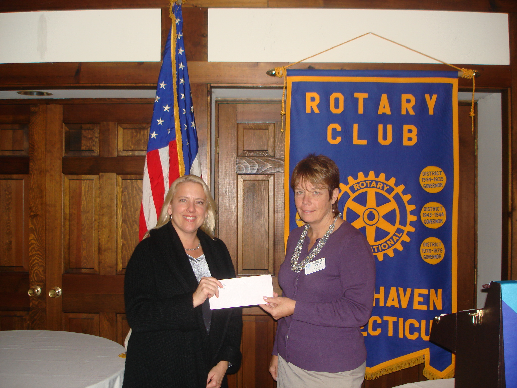 Kathleen Wielk, President-elect of the West Haven Rotary, presents Marilyn Wilkes with a $500 check to support the West Haven Community Garden project.